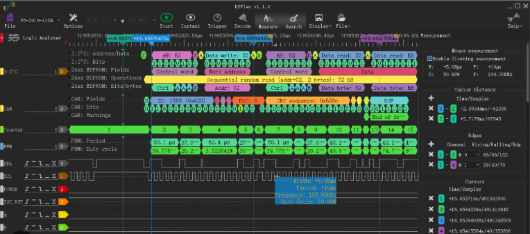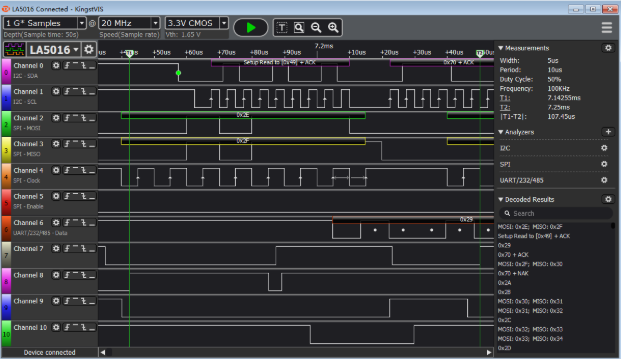 • Protocol Decoders: The most important feature. You don’t want to see raw lines; you want the software to say: “Here is the I2C Start bit, and the data is 0xAF.”