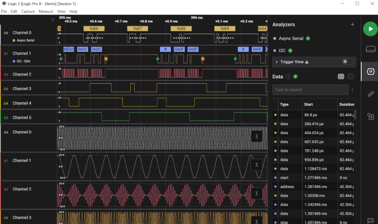 Triggers allow you to sync the capture with the exact moment an event happens. Rather than sifting through thousands of samples of noise, you can set a condition (edge, pulse width, or protocol address) to start recording precisely when the data starts flowing.