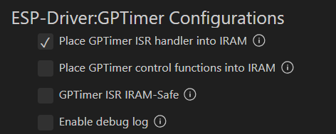 “Place GPTimer ISR handler into IRAM” → This is a recommended option if you need precise timing or fast interrupt response. It stores the interrupt handler in RAM, improving performance by executing code directly from RAM instead of flash.